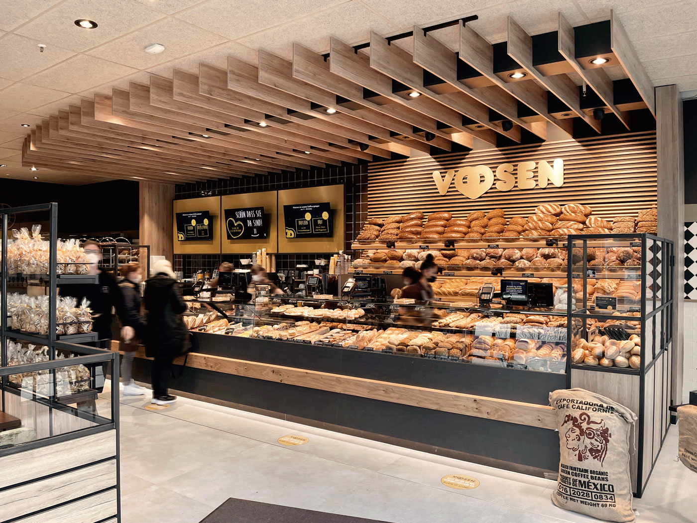 Die neue Filiale der Bäckerei Voosen in Bergheim-Paffendorf mit einem neuen Ladenbau-Einrichtungskonzept. Fokussierte Warenpräsentation durch handgemachte Massivholz-Brotroste und einer optisch reduzierten Backwarentheke. Naturbelassene Materialien und ein bäckertypisches Wandmuster unterstreichen den handwerklichen Anspruch der Bäckerei aus Pulheim.